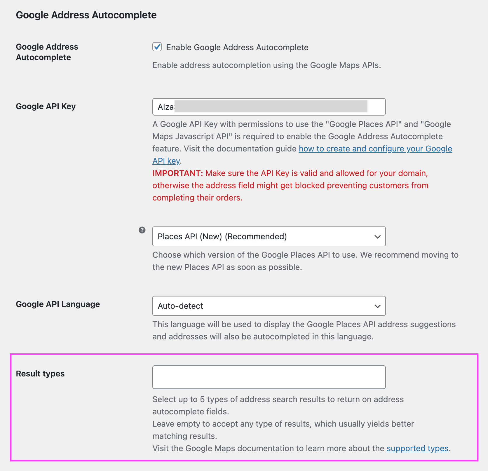 If you have saved the plugin settings at least once on your website, it is likely that the default values for the “Result Types” option has been saved to the database and those values will be used on the checkout page for the autocomplete feature.